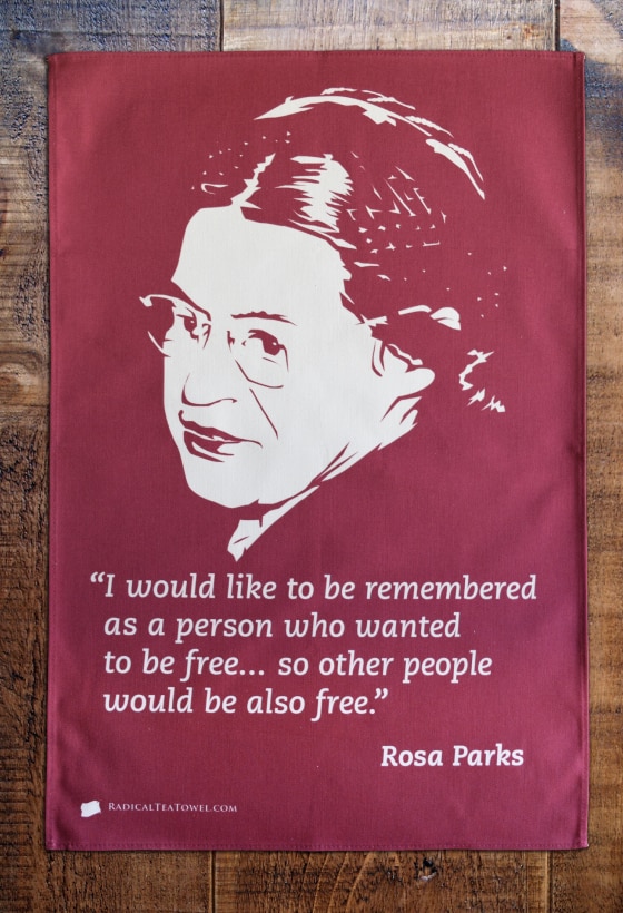 June 13, 2018 ‘Radical Women and their Political Struggle’ or, alternatively ‘A Homage to Four Beatrices’. A Tea Towel Collection. 560 × 820 0EBD7A90-F02C-4A02-BF13-14449E95ACC0 Rosa Parks (1913-2005), known as ‘First Lady of Civil Rights’ and ‘Mother of the Freedom Movement’. She refused to give up her seat to a white woman on a bus in Montgomery, Alabama. On ‘loan’ from Radical Tea Towel Company